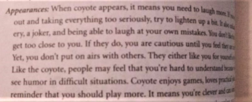Today, having had time to think, I remember asking my guides about a book I bought earlier in the day. I asked what helpful information it could offer for me to consider it worth purchasing. Given a page number, it opened to Coyote: “You need to laugh more.”