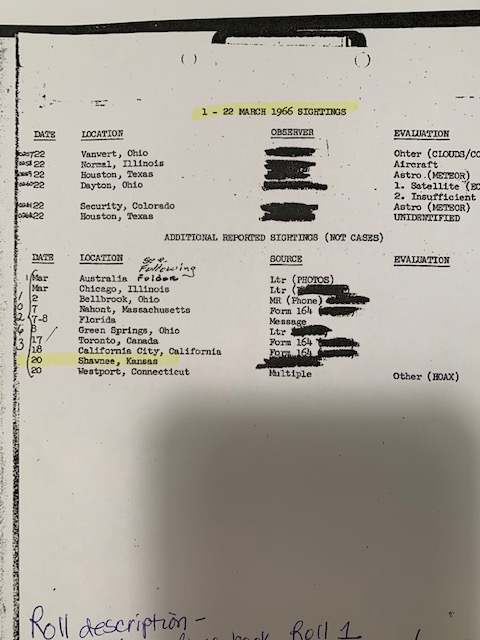 When someone suggested her sighting report might be listed in the Project Blue Book files, she conducted a tedious search and found it. (Excellent!) She shared that information with me and gave me permission to post the items here.
