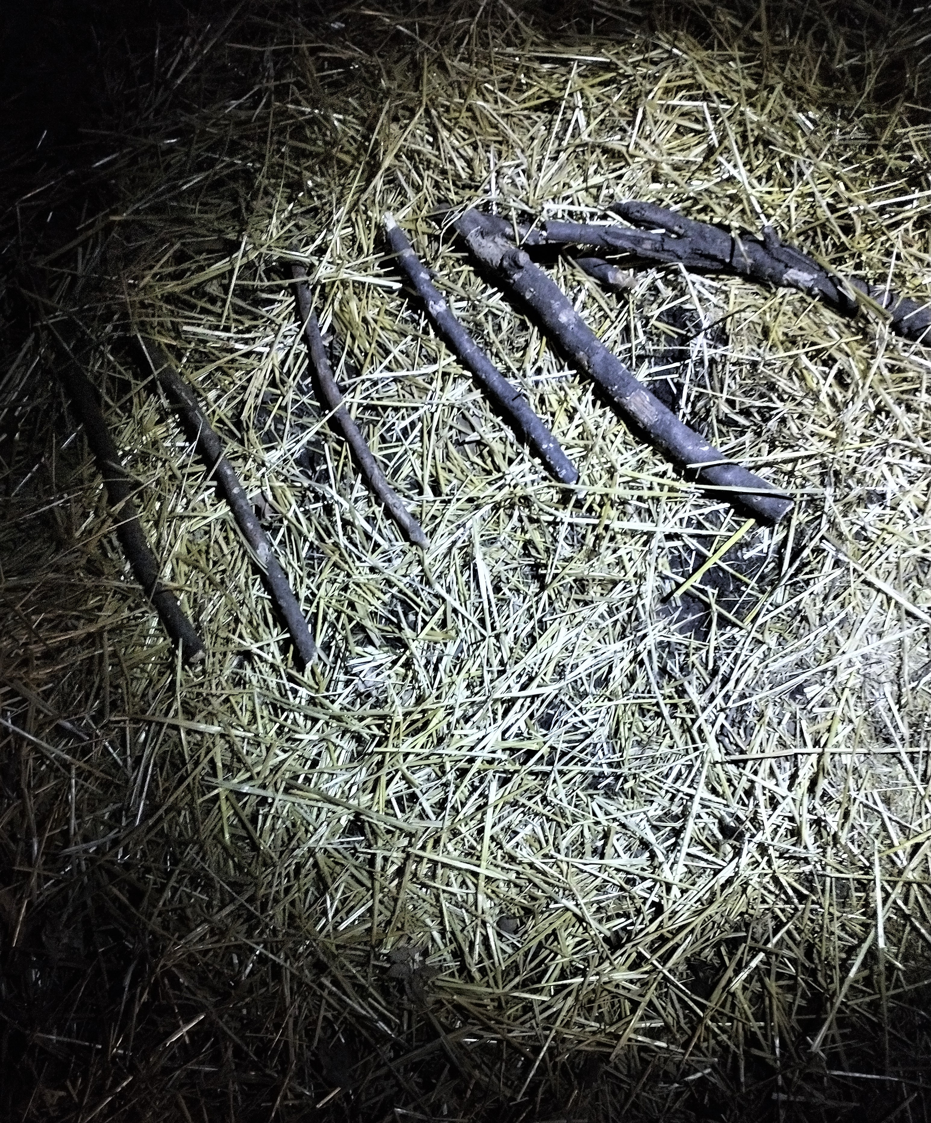 About that paranormal visitor I mentioned in the previous post. We have a clue. Andy found an unusual display in the yard. Sticks arranged in a row.
