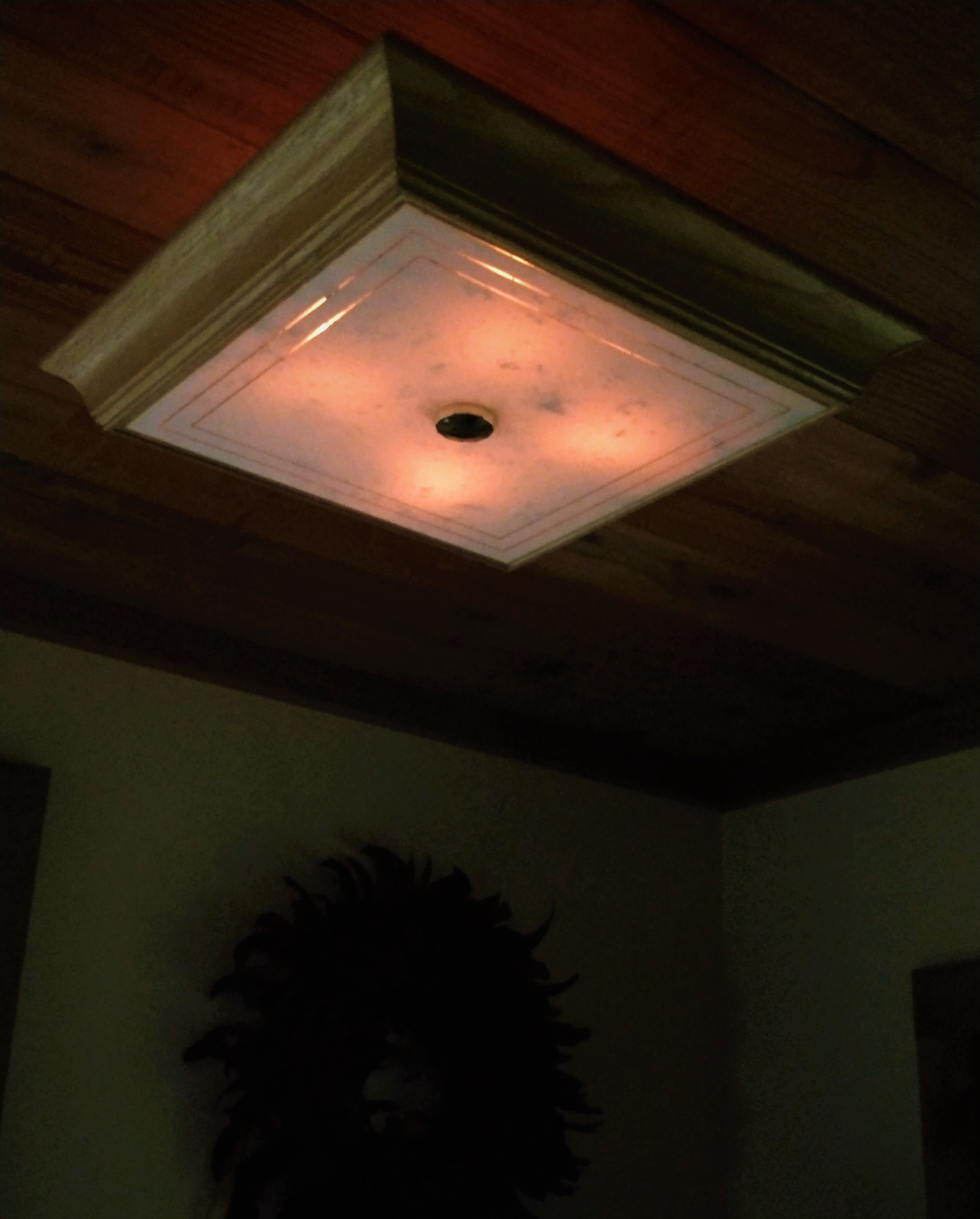 What was on? The ceiling light. Glowing a soft orange. That light is on a dimmer. It clicks when it is completely off. Andy had turned it off earlier. He was asleep in the room with Jack. Their door was closed. The glowing orange light was now on with Cassie directly below, completely unfazed.