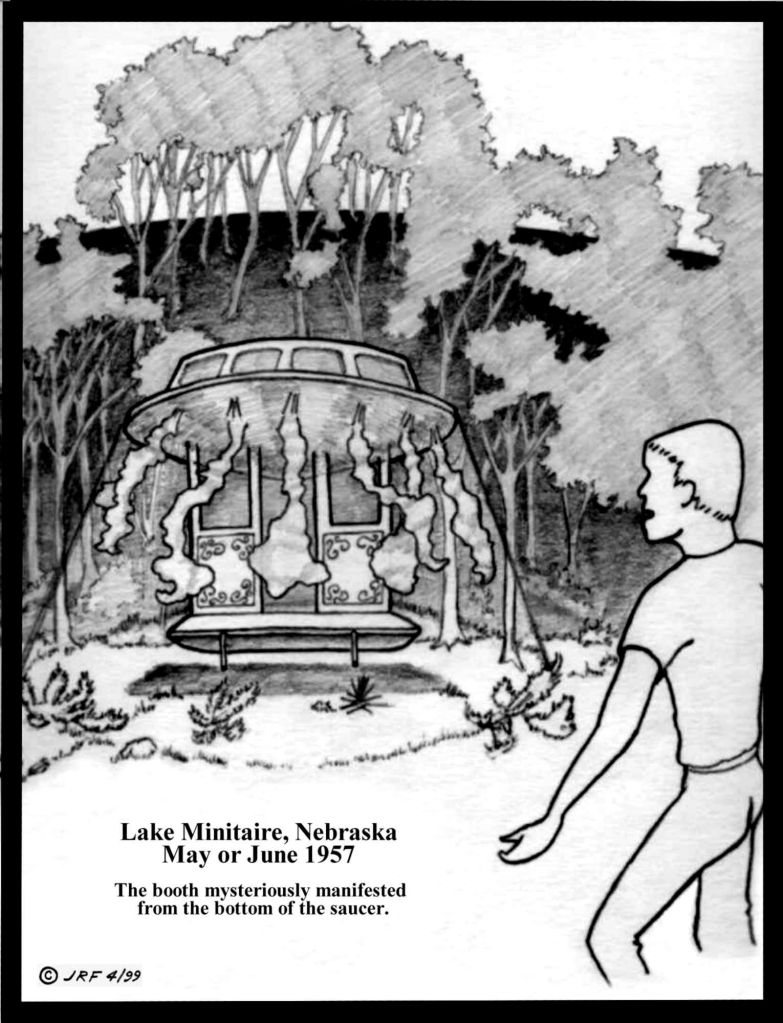 I was sitting by a Native American woman telling a few people about my encounters. And I mentioned the saucer booth routine. It was then the Indian woman told me that sort of routine involving the booth was occurring and had occurred on the Indian reservations. She said it normally happened when young boys were reaching about the age of 13. It seemed to be connected to a mysterious spiritual ceremony for boys, when they were passing from childhood into adulthood. She emphasized that the booths mysteriously materialized.