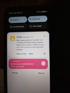 It took a little over 24 hours to clear. This little anomaly might have helped. Sunday morning, Feb. 12, I got a wayward text. It was a reminder from our veterinarian for an appointment on Feb. 14 for a dog named Max. My dog named Max died in 2007. He had never been to that vet. Here is the text.