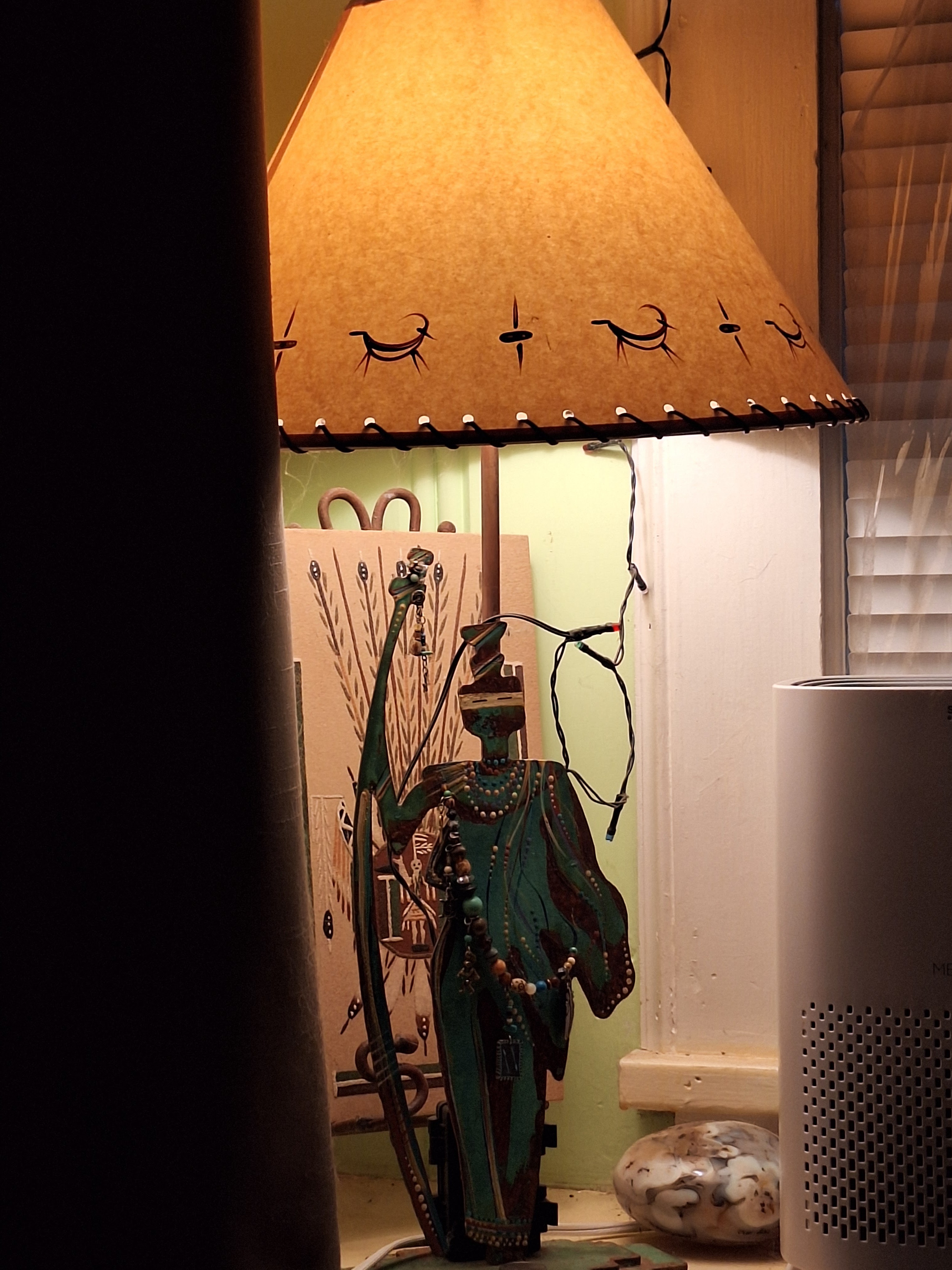 Last week, the beside lamp began interacting. 8pm, August 3, 2024. We were watching something on Netflix {Rebel Moon – Andy watched as I read e-mail and played solitaire} when the light bulb* began flickering, flashing and turning off.