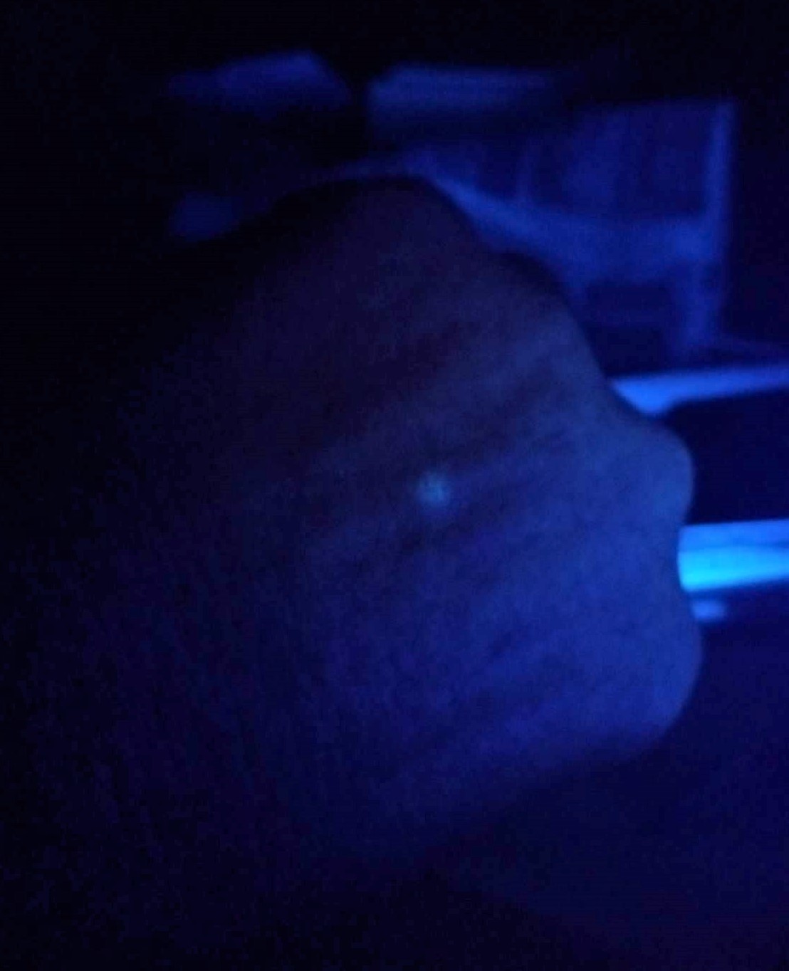 The mark on the back of Orville’s hand glowed and showed up in a photograph. It disappeared after a few days. Cheryl provided a picture.