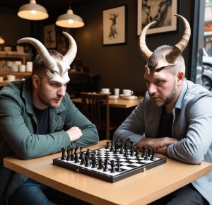 It all started in a coffee shop. Andy and I were sitting, casually chatting, when a man walked by outside. He had horns and a tail. I froze. A glance toward the chessboard inside confirmed it wasn’t just my imagination—one of the players, the shop owner, also had horns and a tail. He was deep in conversation with a college professor across the table, who shared the same striking features.