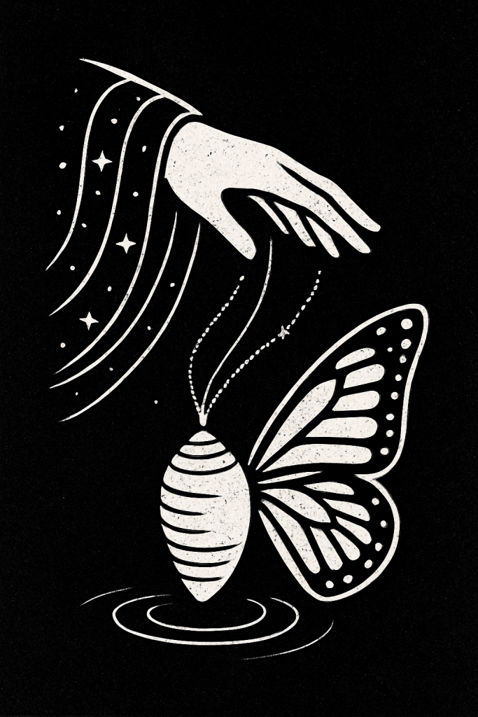 Message: You are entering the cocoon, unaware of the shape you are becoming. The shift is seamless, without a clock, guided by forces unseen. Old forms dissolve to dust; that dust can take any shape you imagine.