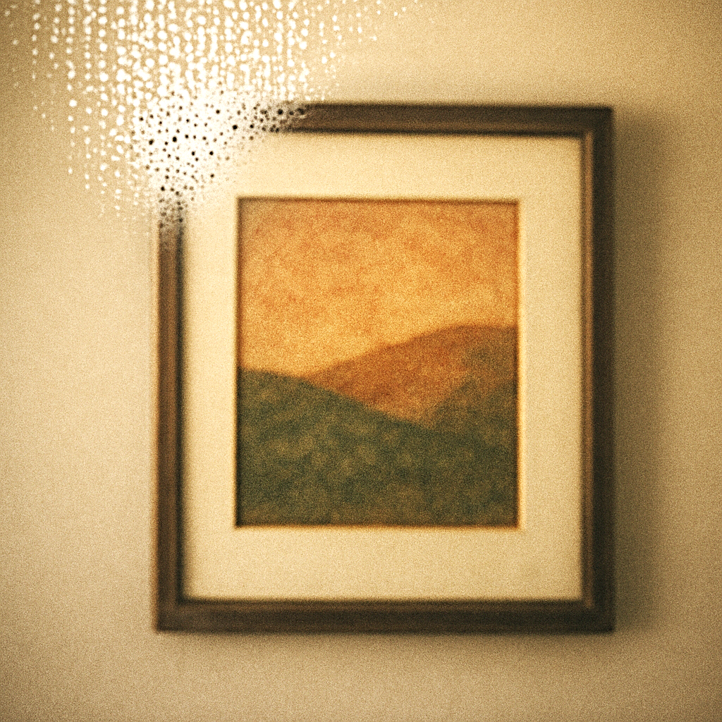 The upper-left corner of the picture seemed to come alive. A pool of white bubbled with black dots, flowing outward as if reality had sprung a leak. The display appeared to emerge directly from the frame, overlaying the wall beside it. Even when I blinked, the vision didn’t fade.