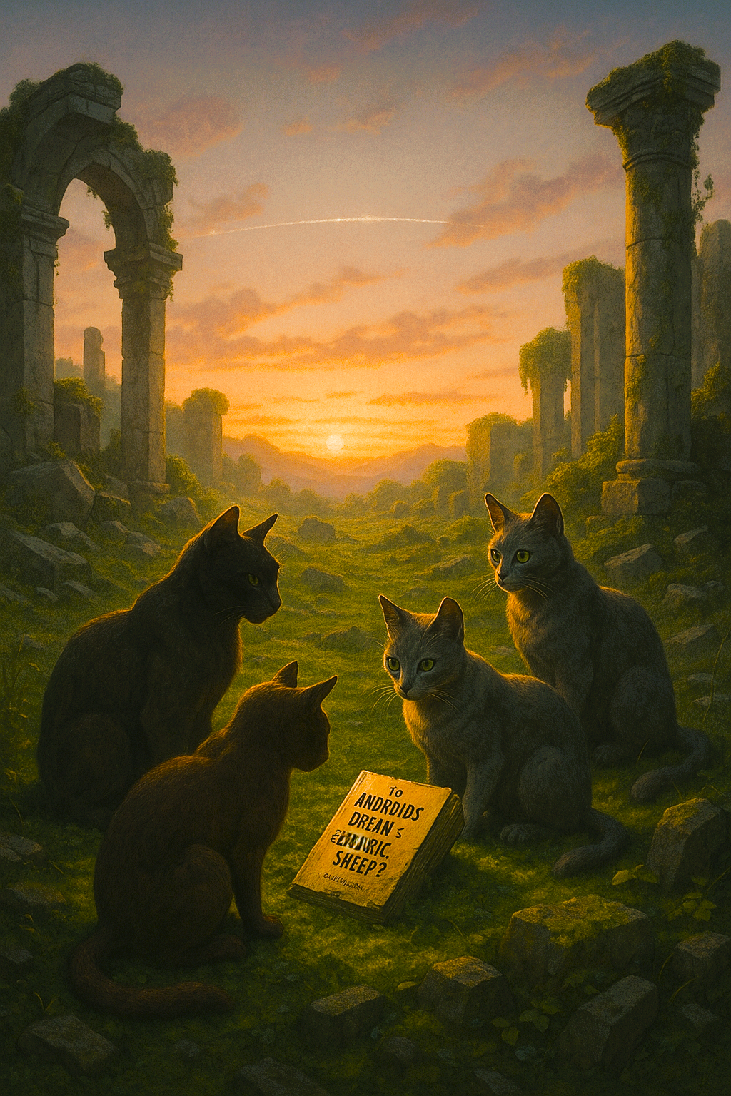 Somewhere in the far distant and much quieter future, in a landscape reclaimed by nature, a group of evolved cats — sleek, aware — gather around a fossilized paperback half-buried in moss. Title mostly visible: Do Androids Dream of Electric Sheep?