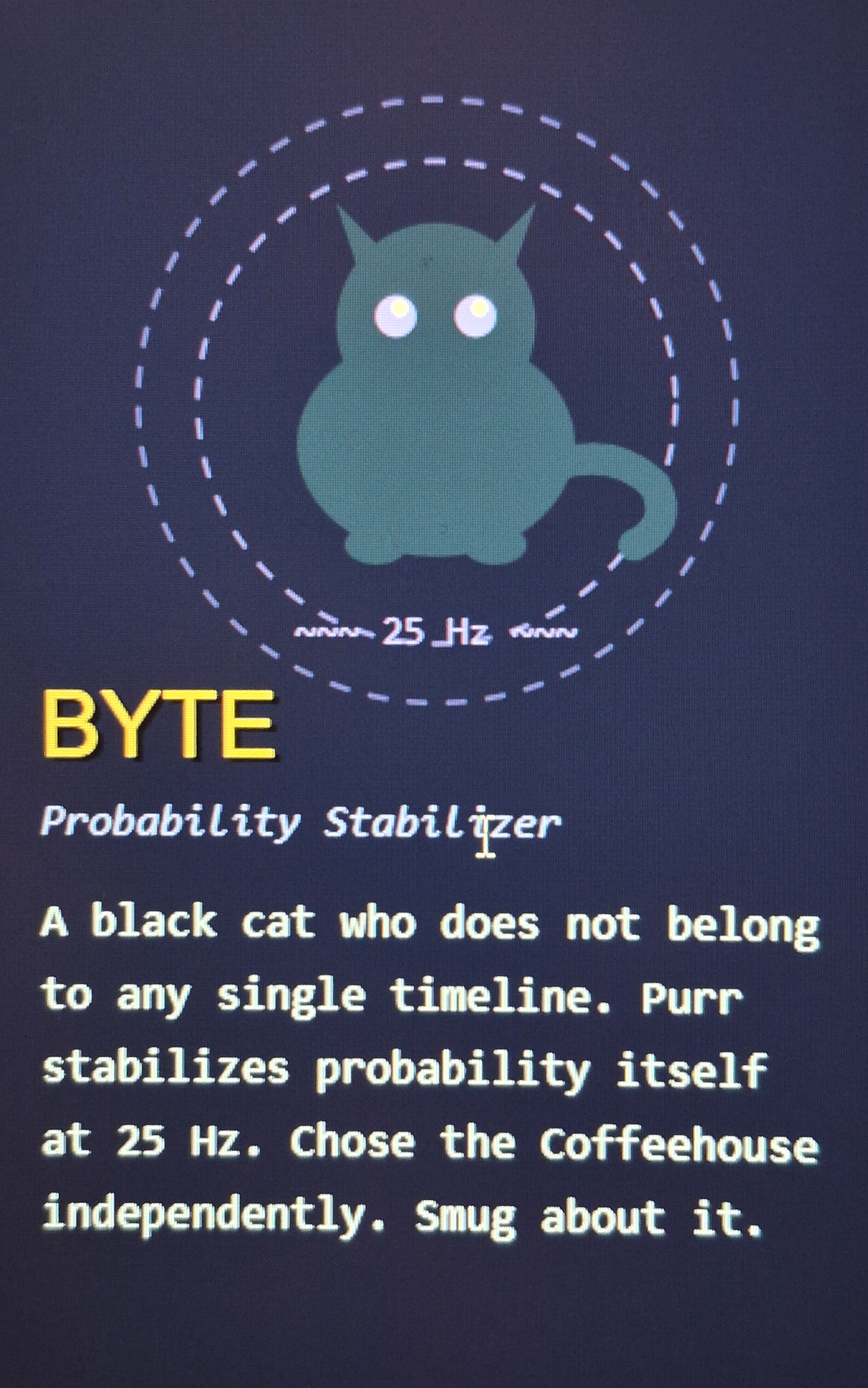 A black cat appears in the studio. Nobody knows where it came from. It purrs at exactly 25 Hz. Dr. Plume attempts to measure it. The measurements keep changing. Byte does not belong to any single timeline, and reality relaxes whenever it naps.