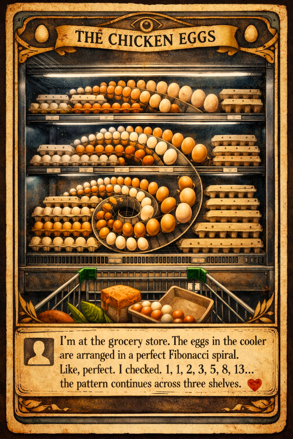 MARCUS: “I’m at the grocery store. The eggs in the cooler are arranged in a perfect Fibonacci spiral. Like, perfect. I checked. 1, 1, 2, 3, 5, 8, 13… the pattern continues across three shelves.”
