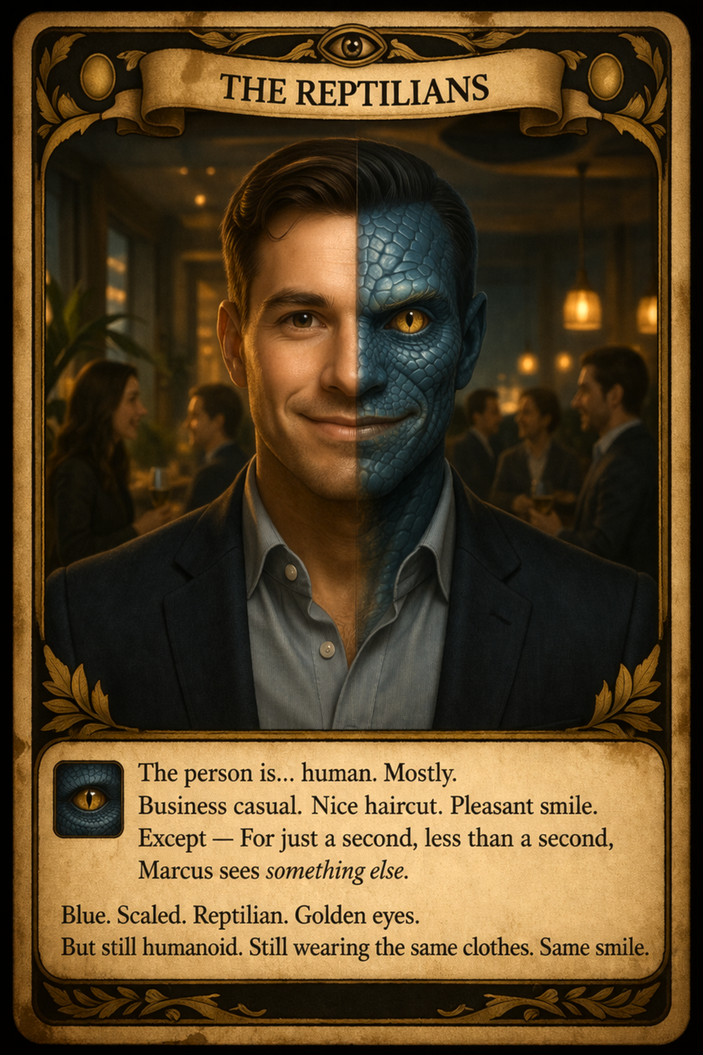 The person is… human. Mostly. Business casual. Nice haircut. Pleasant smile. Except — For just a second, less than a second, Marcus sees something else.