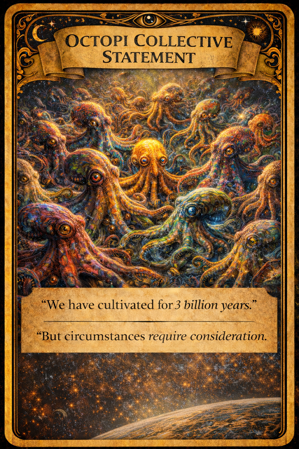 The octopi, who normally coordinate through mycelial networks, manifest physically. Hundreds of them. Various sizes. All colors shifting rapidly. Stress.